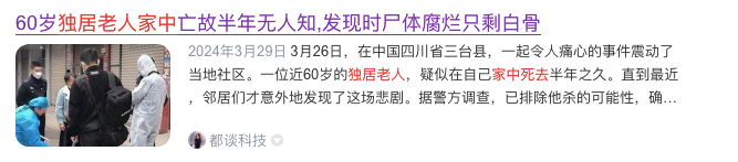 2024年,四川一位老人在自己家中去世,直到半年后,才被邻居发现,打开门的时候,老人的尸体已经严重腐化,惨不忍睹。