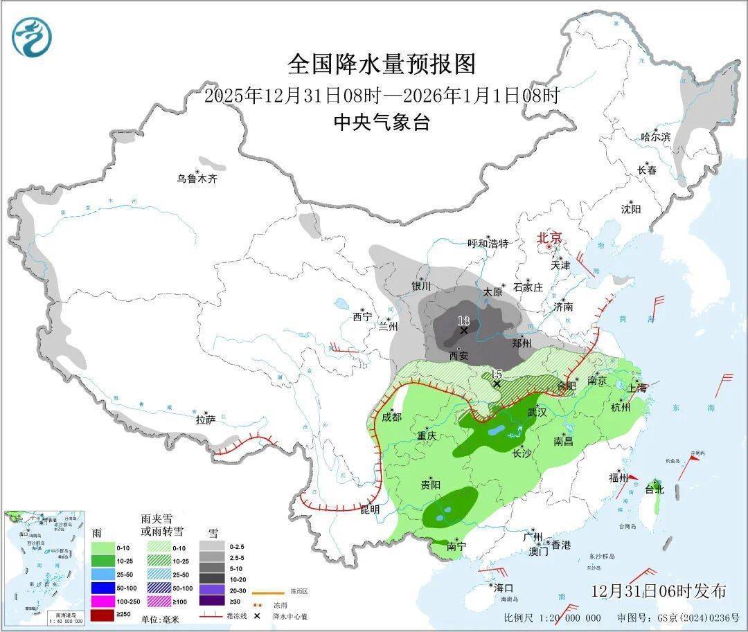 中央气象台继续发布大风、寒潮、暴雪蓝色预警。雨雪天气的最强时段为今天(31日),西北地区东部、华北南部、黄淮西部、江汉、江淮等地有小到中雪或雨夹雪,陕西、山西、河南、湖北、安徽等地部分地区有大雪或暴雪,西南地区东部、江南、华南等地有小到中雨,局地大雨;2026年1月1日起,雨雪范围和强度明显减小。